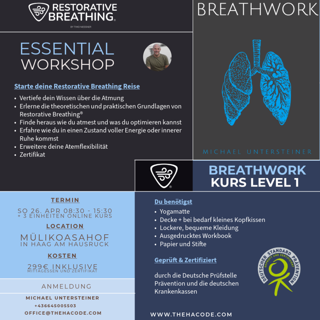- RESTORATIVE BREATHING® ESSENTIALS (So. 08:30 – 15:30) Der zertifizierte Deep Dive in die Welt des Atems (Level 1).